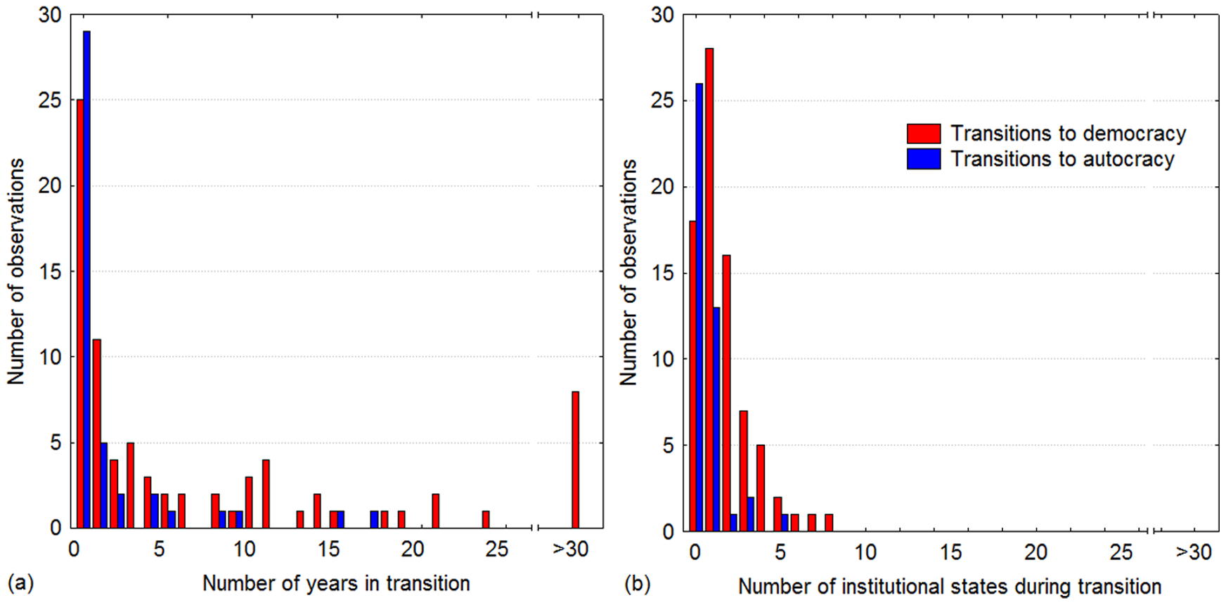 En observant l’évolution des scores dans le temps, les chercheurs ont découvert qu’il existait 122 transitions entre démocratie et dictature, 79 transitions décrivaient un passage d’un régime autocratique à un régime démocratique et 43 allaient dans l’autre sens. Sur les 860 changements institutionnels, 511 s’orientaient sur plus de démocratie et cela de manière significative statistiquement, confirmant l’avis général d’un monde récent tendant vers la démocratie.