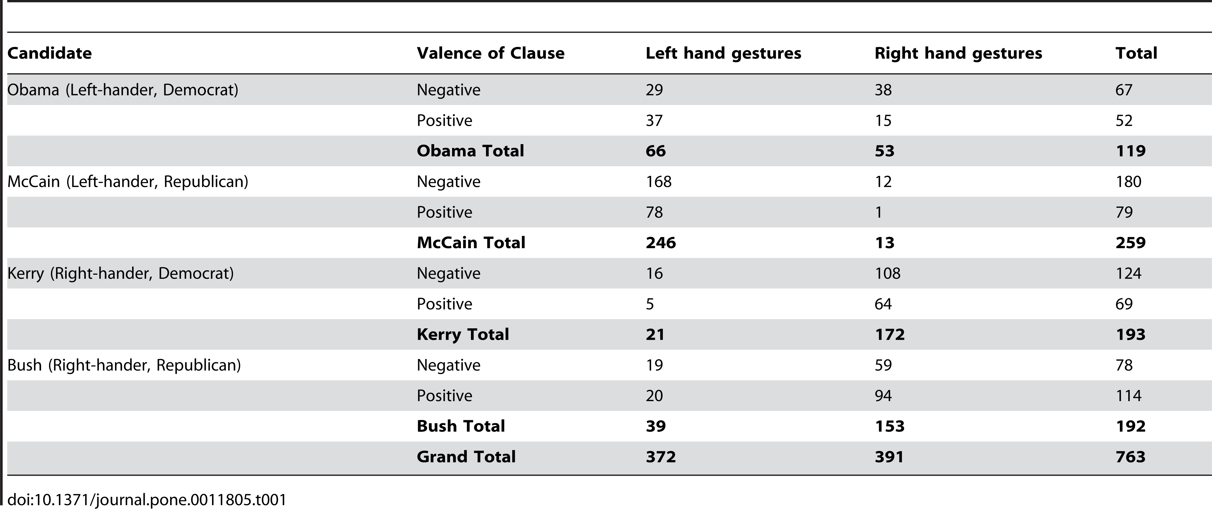 Notons que la « puissance » de la latéralisation corporelle est plus importante que celle de la représentation sociale. En effet, Kerry (démocrate) est droitier et Mc Cain (républicain) gaucher, la valence émotionnelle de leurs gestes est inverse à l’arbitraire dichotomie politique gauche/droite.