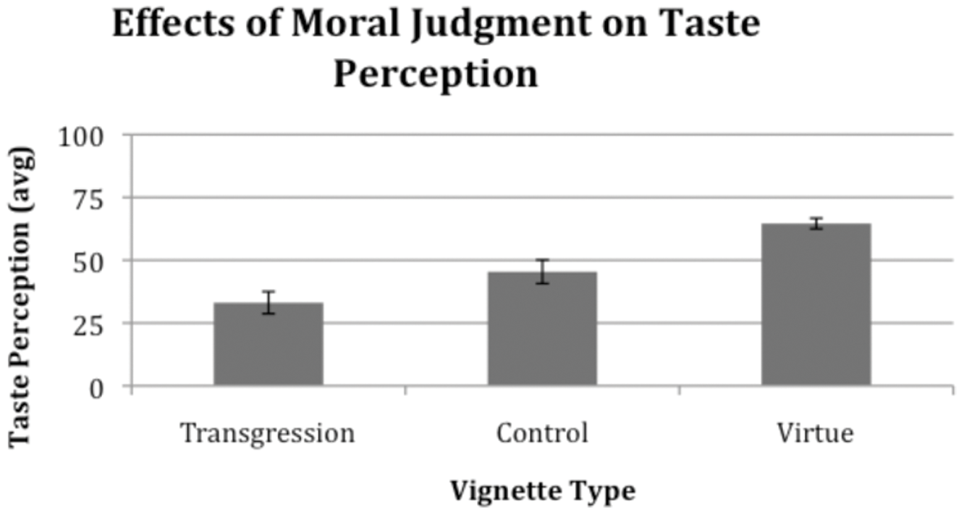 Les vignettes eurent l’effet escompté, elles étaient effectivement considérées selon les modalités expérimentales voulues. Plus que cela, elles ont induit une différence significative de perception du goût, la vertu améliorant le goût de la boisson à l’inverse de la transgression. L’analyse statistique portant sur le caractère amer et sucré de la boisson ne révéla aucune différence significative, c’est donc la notion de dégoût, non d’amertume qui serait liée à la transgression morale.