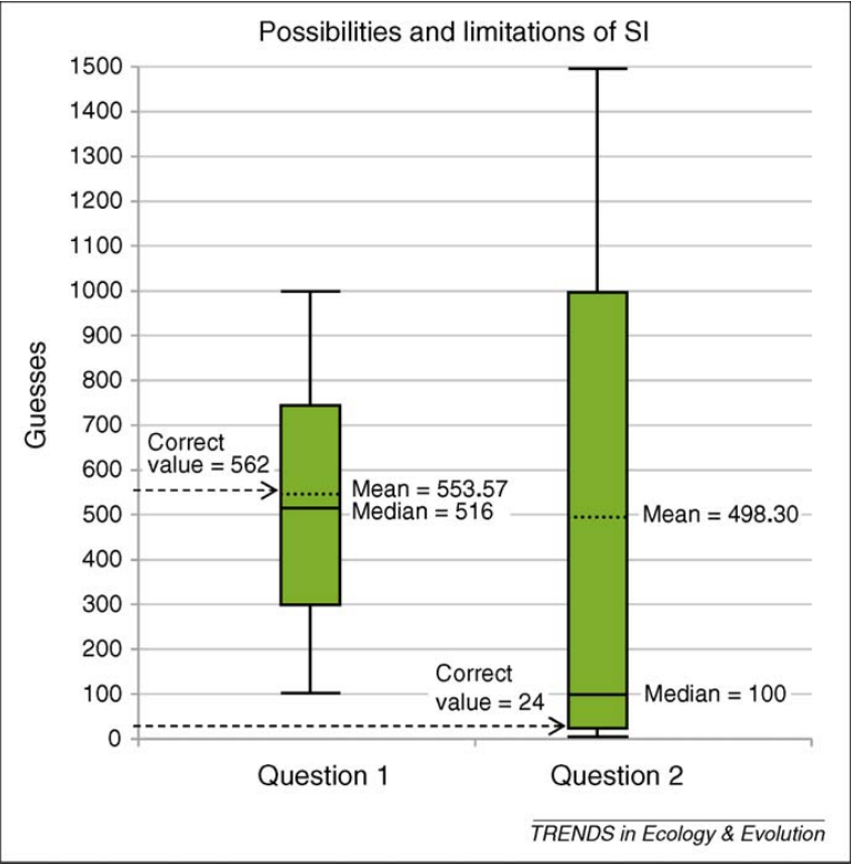 En 2009, les chercheurs Kraus, Ruxton et Krause évoquent une expérience pour mettre à l’épreuve l’intelligence collective. Deux questions sont posées à une série de personnes, la première est d’estimer le nombre de billes numérotées dans un grand bocal en verre, la seconde d’estimer le nombre de fois où il faut jeter une pièce pour que la probabilité de tomber sur face à toutes les occasions soit aussi faible que de gagner au loto allemand. Pour le premier problème l’estimation collective était autour de 1,5 % de la valeur exacte, montrant une certaine efficacité de l’intelligence collective (cependant l’écart au sein du groupe étaient large). En revanche, pour le second problème, tous experts en analyse combinatoire arriveraient par le calcul au résultat certains de 24, là où la moyenne des participants était de 498,30.