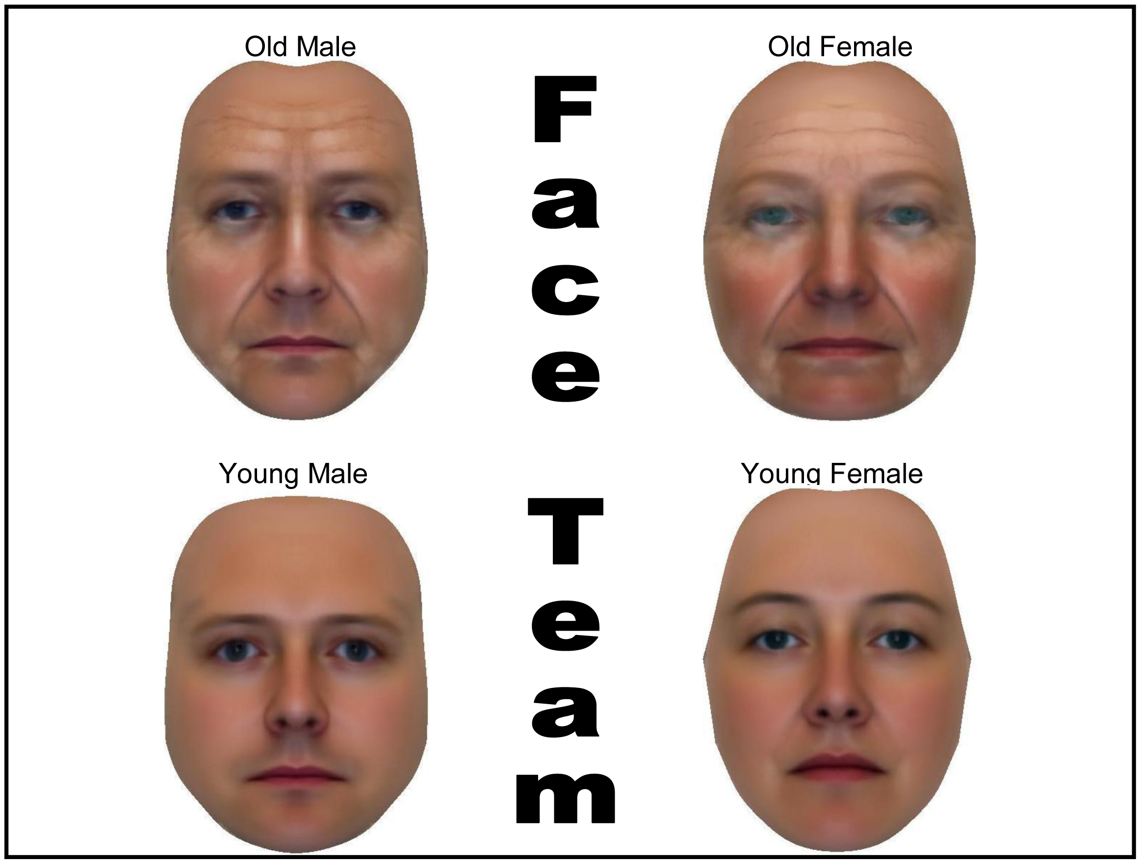 Visages artificiellement créés, servant de support aux votes des participants. Avec dans l’ordre usuel de lecture, les vieux: homme et femme, puis jeunes: homme et femme.
