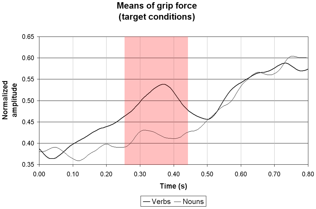 Les mesures montrèrent une différence significative entre la force exercée pendant l’écoute d’un verbe d’action et la force exercé lors de l’écoute d’un nom. Une augmentation importante de la force de pression était observable dès 100 ms après que le verbe fut entendu avec une déviation significative par rapport à la courbe des noms autour de 260 ms.