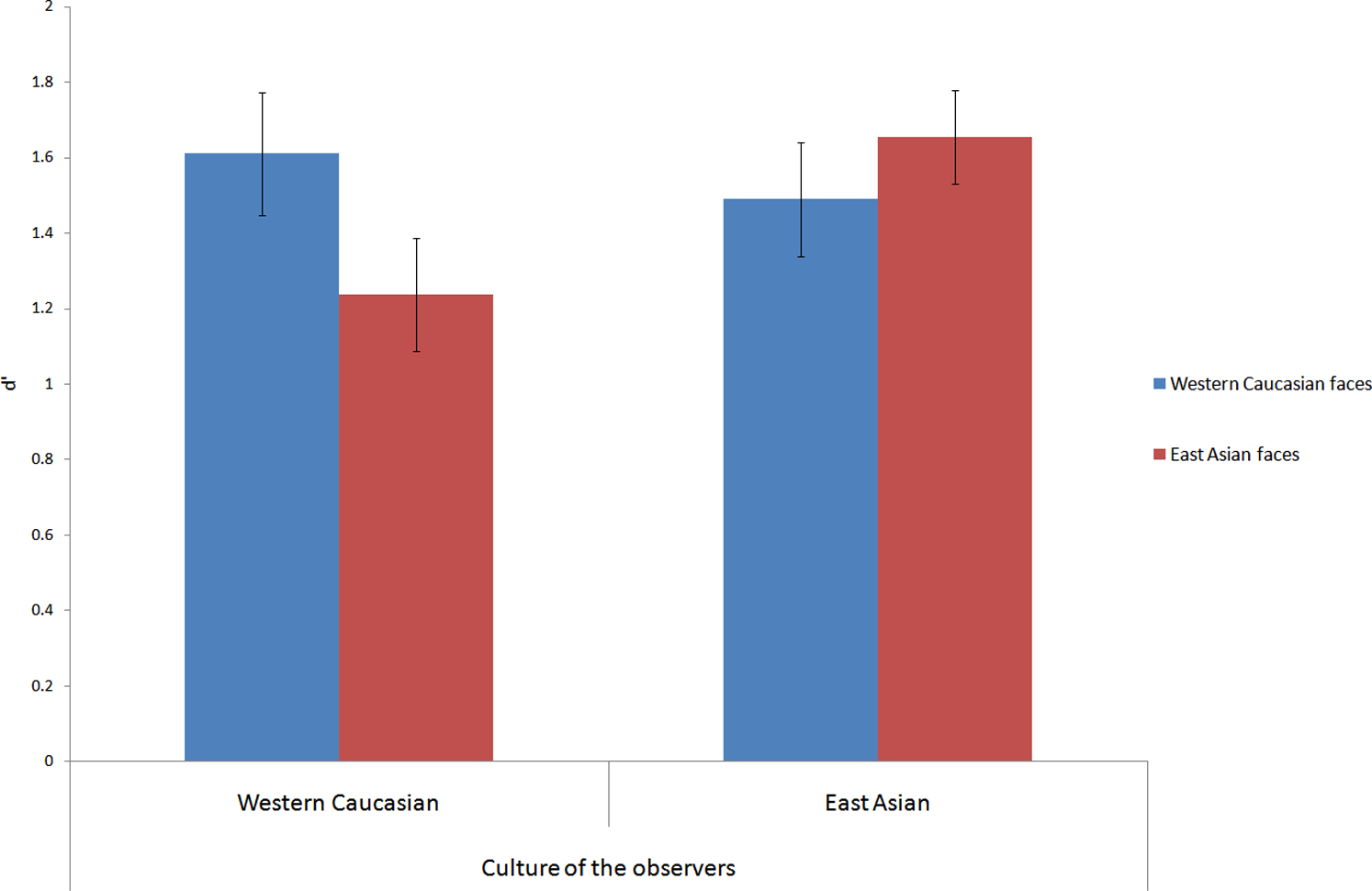 Résultats dans la tâche de reconnaissance des visages. Avec en abscisse dans l’ordre usuel de lecture les deux groupes cultures des observateurs(occidentaux/caucasiens) et (orientaux/asiatiques). En ordonnée la valeur d’ mesurant les performances dans la tâche. Le bleu représente les visages occidentaux, le rouge les visages orientaux.