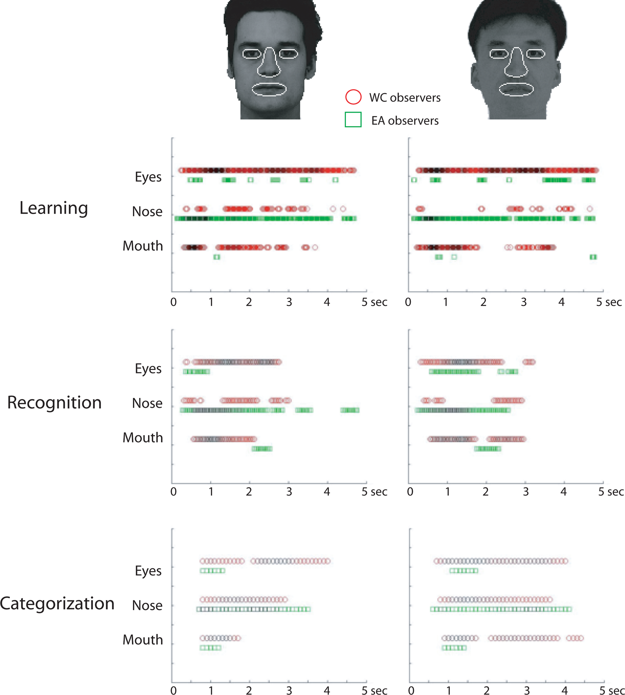 L’autre découverte, c’est qu’en dépit de performance quasi identique, les caucasiens et les asiatiques ont eu en définitive à peu près les mêmes résultats en reconnaissance et catégorisation, il existe des stratégies différentes entre les deux cultures. Les orientaux observent majoritairement le centre du visage, que ce soit pour apprendre, reconnaitre ou catégoriser et ceci pour des visages de leur propre ethnie ou de l’ethnie caucasienne. Les occidentaux eux, s’attardent plus sur les yeux, le haut du visage (sourcils, cils etc.) et dans une moindre mesure, la bouche.
