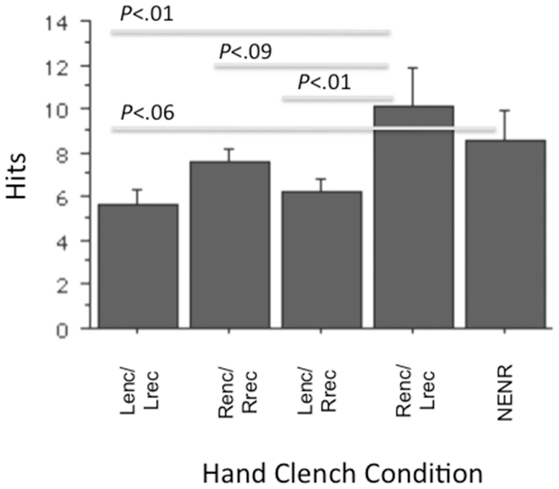 Nombre de mots corrects rappeler à l’issue de l’expérience. Avec en abscisse, les conditions: Lenc/Lrec = encodage gauche/récupération gauche; Renc/Rec = encodage droite / récupération droite; Lenc/Renc = encodage gauche/ récupération droite; Renc/Lrec = Encodage droite/ récupération gauche; NENR = sans condition d’encodage et de récupération spécifique. En ordonnée, le nombre de mots correct rappelé. Les valeurs P désignent les seuils de significativité statistique.