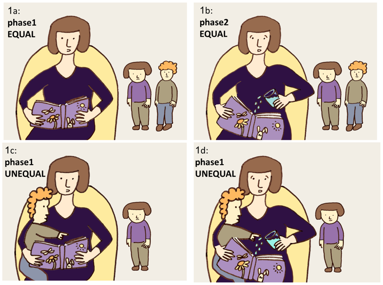 En juillet de cette année, Shamay-Tsoory du département de psychologie de l’université d’Haïfa et ses collègues, testèrent la théorie « aversion à l’inégalité ». 105 participants se divisant en triades composées d’une mère, de son enfant et d’un enfant proche (camarade scolaire) furent mis à contribution. Dans l’expérience, deux conditions : une dit « contrôle » où la mère assise sur un fauteuil, lisait pour elle-même un livre, sans prêter attention aux enfants, à un certain moment (2 min après le début de la lecture) la mère faisait semblant de faire tomber de l’eau accidentellement sur son livre (condition égale). Les enfants de leur côté pouvaient jouer librement. Dans la seconde condition (condition inégale), la mère prenait l’enfant « camarade » sur ses genoux et lui lisait le livre, jusqu’à ce qu’elle fasse « accidentellement » tomber l’eau sur le livre (2 min après le début de la lecture ou à partir d’une gêne trop visible chez l’enfant cible).