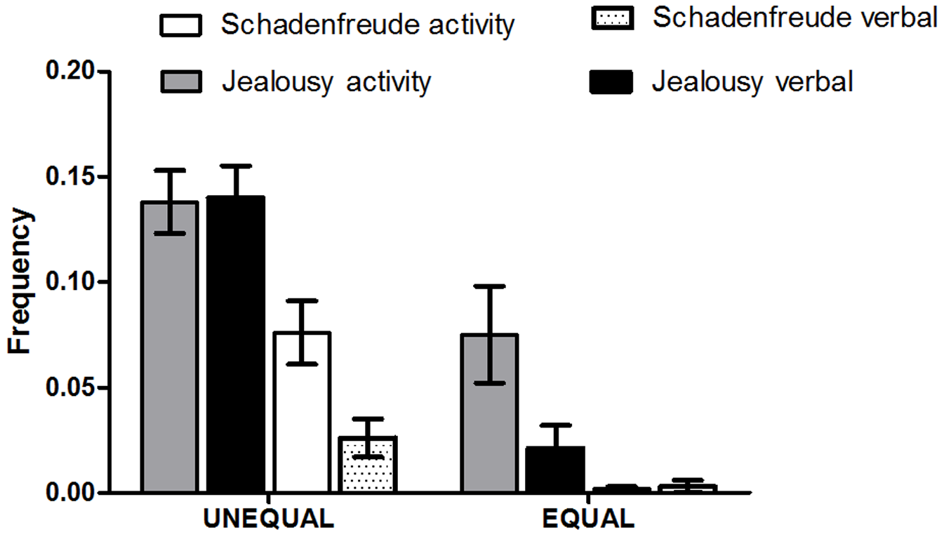 La théorie visant à faire du schadenfreude la conséquence d’un attrait pour le gain personnel aux dépens du gain des autres est plutôt mise à mal par le fait que c’est en condition « inégale » que la réaction émotionnelle des enfants était la plus intense. De manière générale, c’est la condition inégale qui soulève le plus de réaction émotionnels et de manifestations explicites de jalousie et de schadenfreude, et cela chez les enfants dès 24 mois, tout se passe comme si l’enfant avait une détestation instinctive de l’inégalité. Le schadenfreude serait la version évolutionniste des mécanismes de répartition de la richesse et la conséquence d’une allocation perçue comme injuste des ressources disponibles. Il est également intéressant de noter la « puissance » du sentiment de jalousie par rapport au schadenfreude, peut-être faut-il y voir un intense instinct de peur de l’abandon, instinct hautement pertinent dans le cas de l’enfance et chez des animaux sociaux.