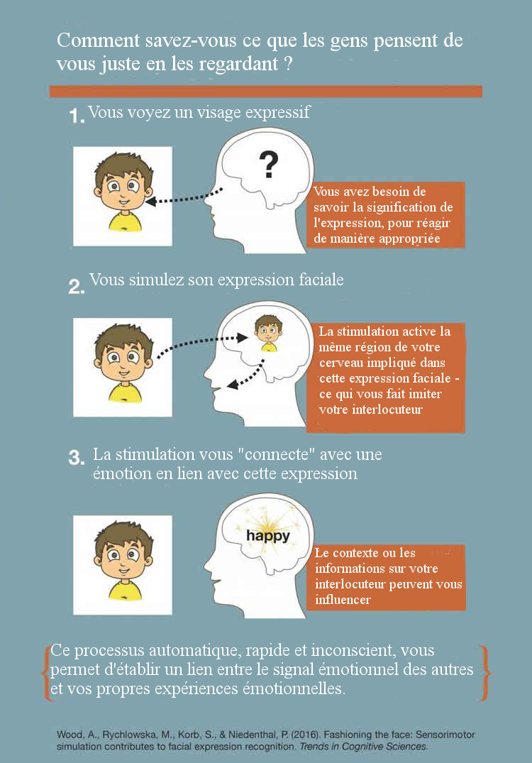 De récents travaux, d’Adrienne Wood et ses collègues de l’Université du Wisconsin, parurent dans « Trends in Cognitives Sciences » cherchant à décrire les mécanismes de contagion des mimiques émotionnelles, comme les sourires ou les froncements de sourcils. Ces études montrent que, nous imitons les expressions faciales de nos interlocuteurs, pour faire naître en nous un sentiment similaire.